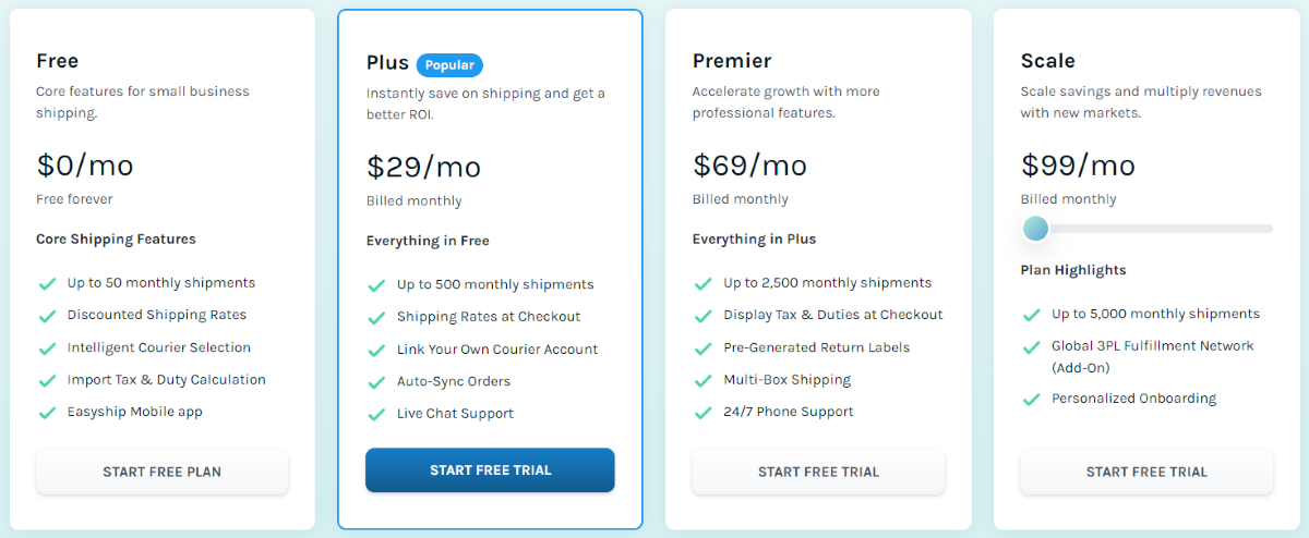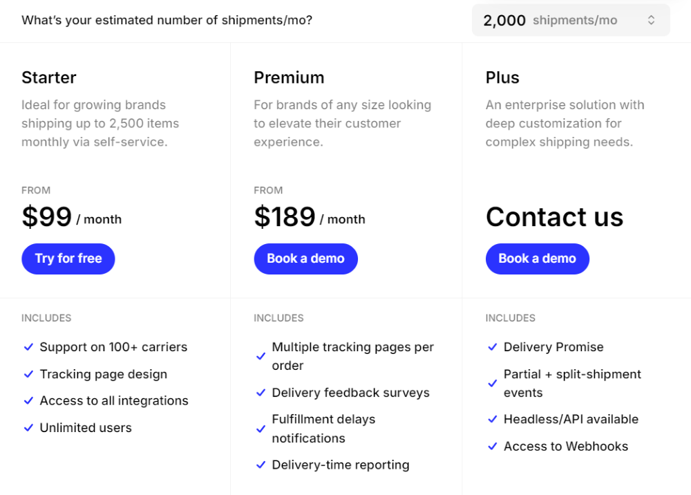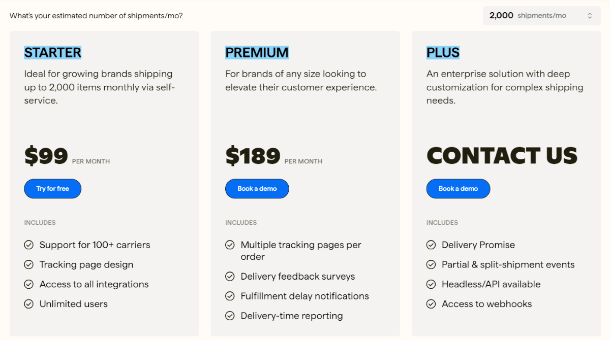 The total number of shipments you make each month determines all prices. Three price categories with various features are available. The Starter, Premium, and Plus plans start at $99, $189, and $449 per month, respectively, and cover up to 2,000 shipments every month. They also give you a 10% discount if you use them for a full year. AI delivery estimates feature is not included in any plan.