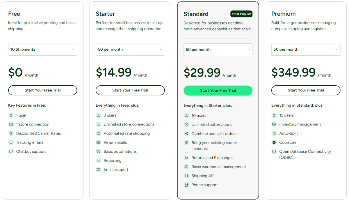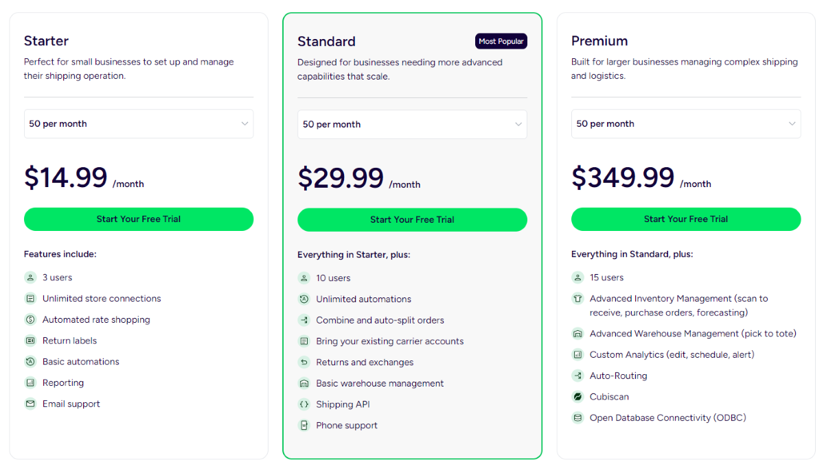 Ecommerce companies of all sizes are part of their target market, particularly those in need of efficient multi-channel shipping solutions. The pricing for this ecommerce shipping software starts at $29.99/month for up to 1000 shipments and scales up to $99.99/month for up to 7,500 shipments. Options for small businesses and custom programs for enterprises are also available—they are a Starter Plan for $9.99/month (50 shipments) and a High-Volume Plan for $399.99/month (unlimited). Additional capabilities like multi-user access and branded shipping choices are available at higher tiers of ShipStation’s price structure.
