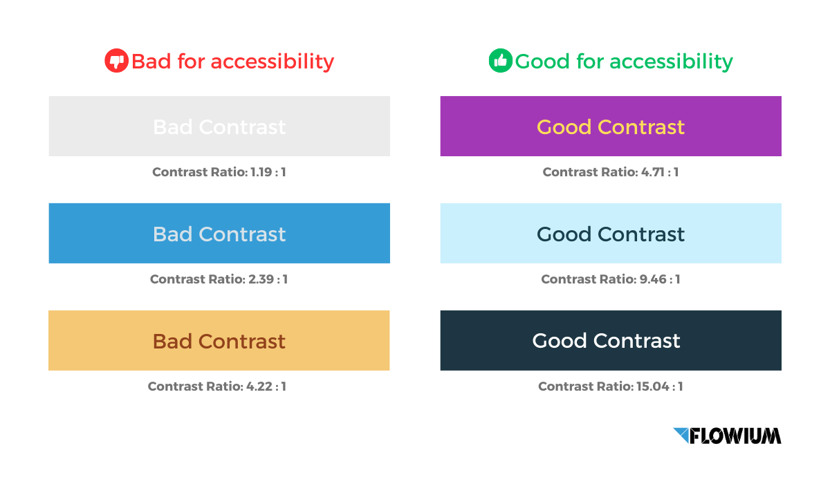- Pay attention to the contrast of the text and the background, a good contrast is 4.5:1. The best contrast is black text on a white background with a value of 21:1. A value of 1:1 means that both have the same tone. Check out the scheme to evaluate the color combinations for yourself.