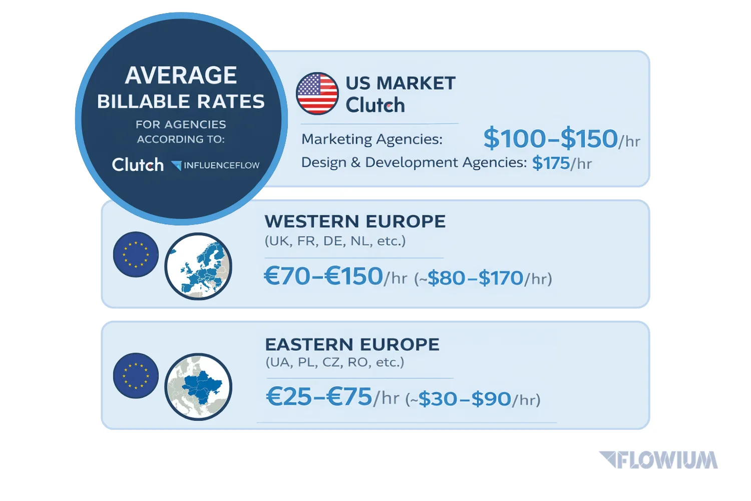 - In Western Europe (UK, France, Germany, Netherlands, etc.) billable rates often run around €70–€150 per hour (equivalent roughly to $80–$170), according to InfluenceFlow.