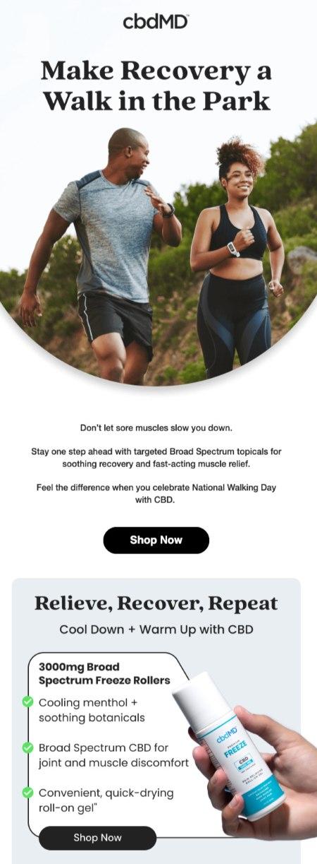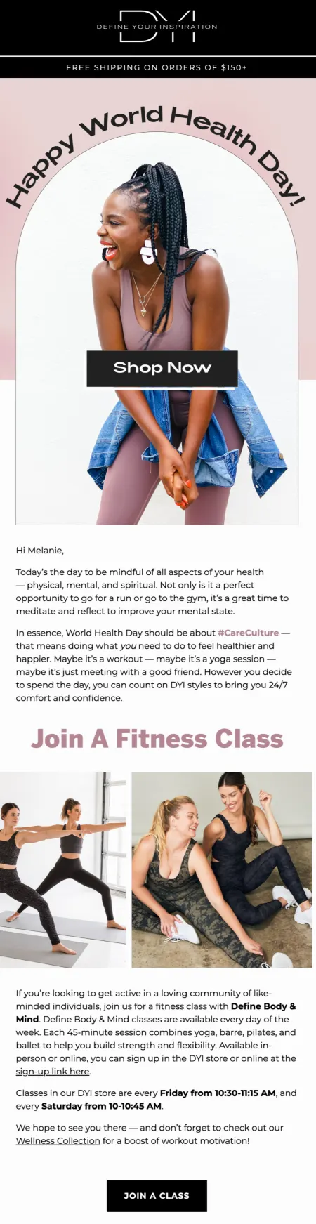 Newsletter Idea: Create a “Wellness & Movement” campaign that encourages subscribers to prioritize their physical and mental health. Combine inspirational messaging with product promotions, highlight fitness classes or activities, and include a strong CTA to shop or join a wellness experience.
