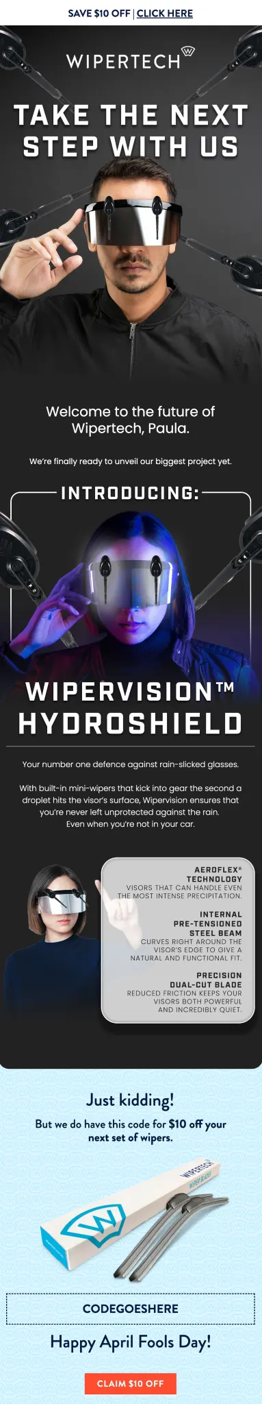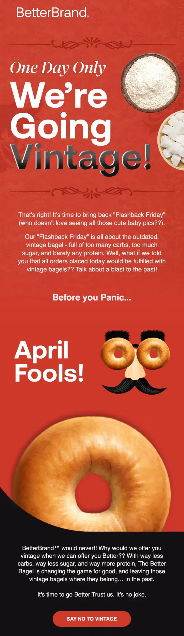 Newsletter Idea: Launch a “Fake Product Reveal” campaign featuring an over-the-top, futuristic innovation related to your brand. Build excitement with sleek visuals and bold claims, then reveal the joke with a playful twist – followed by a real offer or discount to drive conversions.