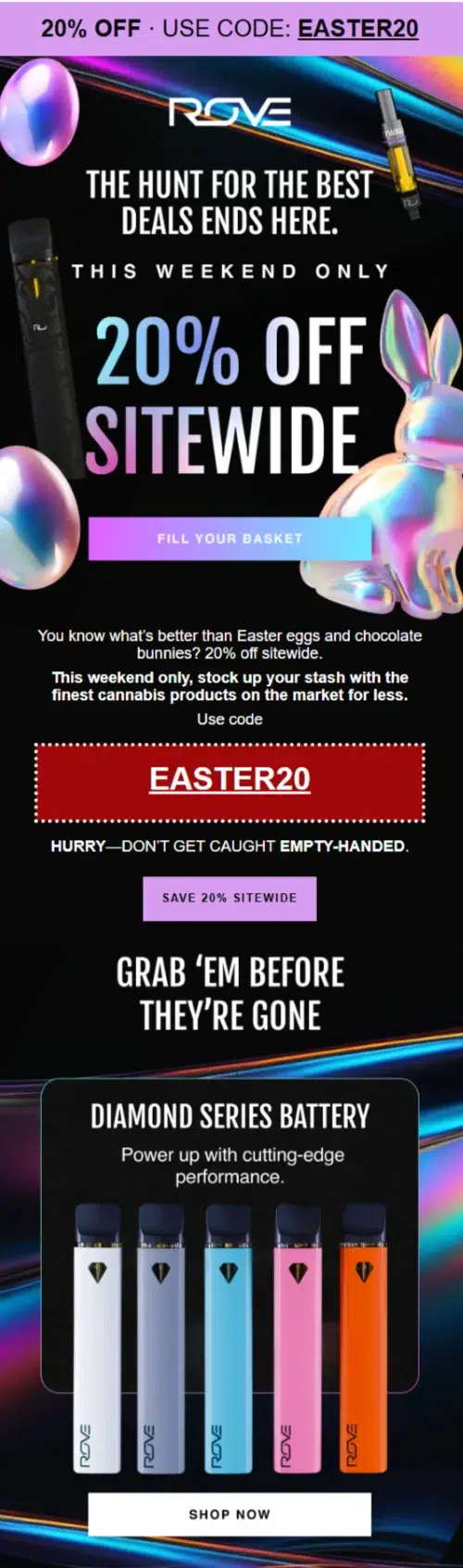 April Newsletter Idea: Launch an “Easter Hunt Deals” campaign featuring a limited-time sitewide discount. Use vibrant, holiday-themed visuals, highlight a promo code, and create urgency with phrases like “this weekend only” to encourage quick purchases and increase conversions.