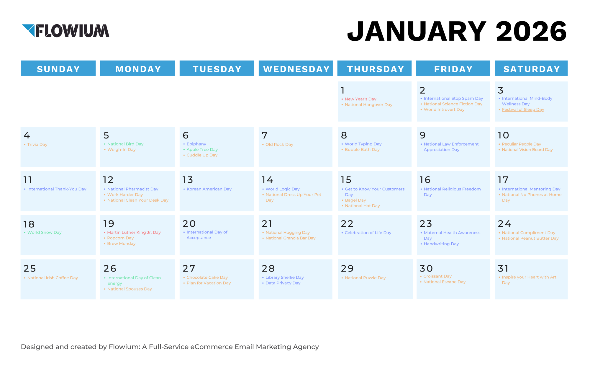 The January 2026 newsletter calendar developed by Flowium provides campaign strategies for every day of the month that you can use for your marketing campaigns.