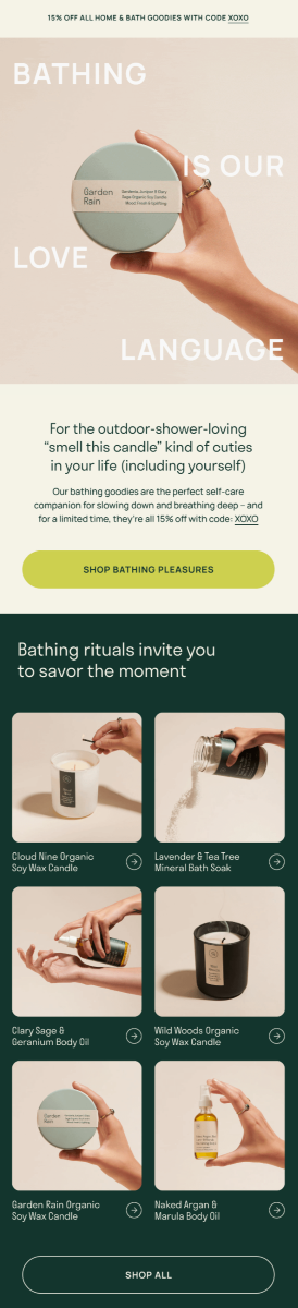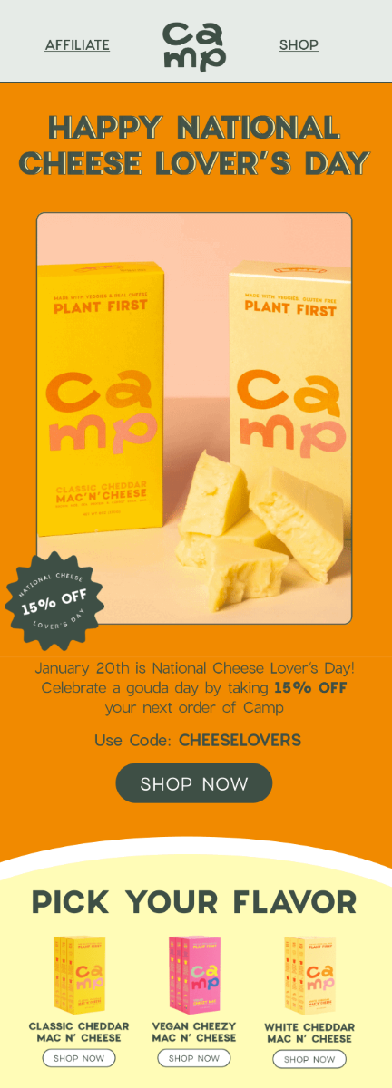 Offer customers to spend time cuddling with their family or significant others. Feature cozy products like blankets, candles, pillows, pajamas and teas. Share self-care tips for relaxation and include a limited-time discount for “Cuddle Up Essentials.”