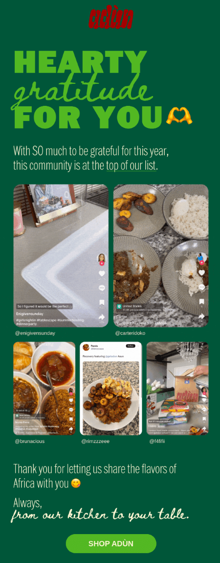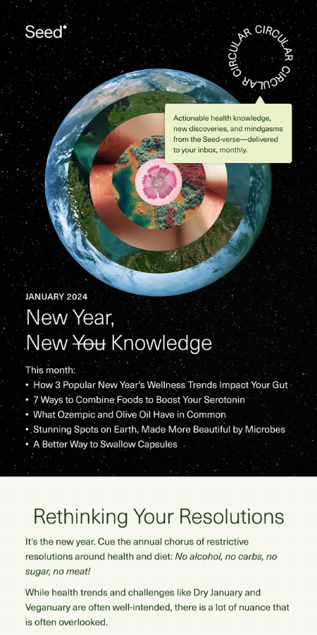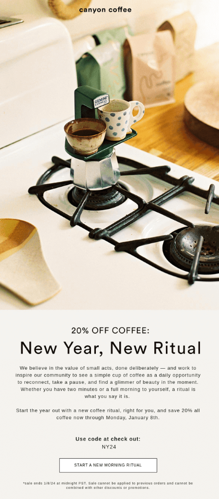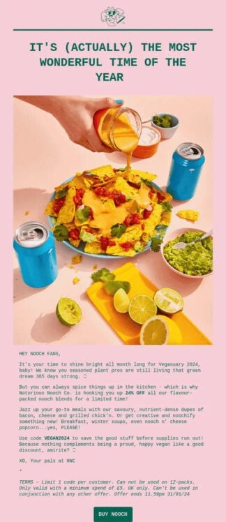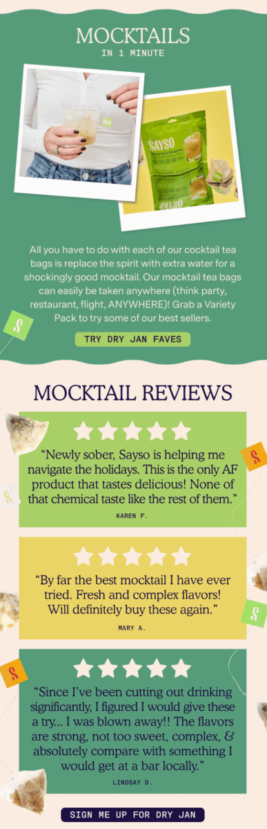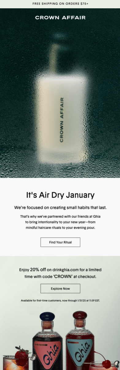 Dry January is a month-long challenge where people decide to abstain from alcohol for the whole month to change their habits after the holidays, get healthier, and begin the year with a clearer head. You can invite subscribers to participate in a 30-day challenge by emailing them with a “Reset & Refresh” theme that highlights wellness advice and alcohol-free product substitutes. Offer a little reward to participants, such as a discount or a free resource.