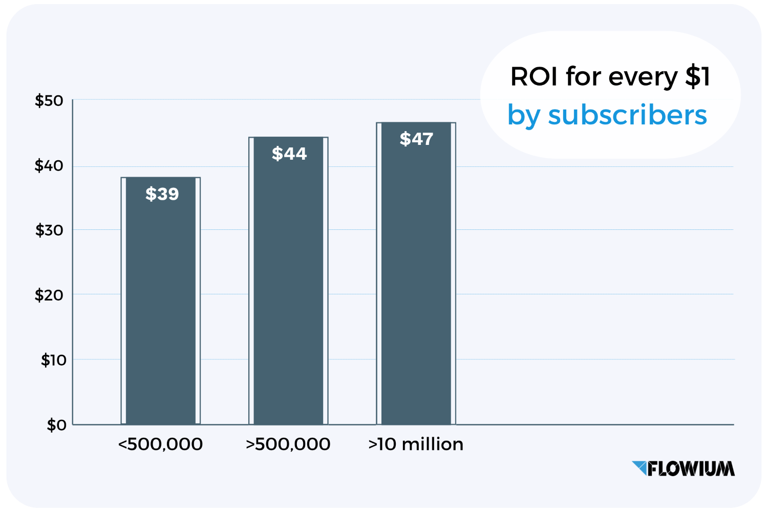 • However, having far more than 500,000 subscribers does not have such a strong impact on ROI, and the difference is significant in the above-mentioned ranges. As confirmation, brands with over 10 million subscribers showed an ROI that was only $2 higher, with a ratio of 46 to 1.