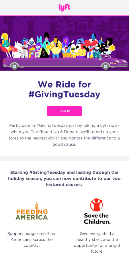 Charitable initiatives typically work well on social media and email channels because they elicit good feelings and encourage sharing. Participating businesses organically grow their reach and promote a worthwhile cause by using Giving Tuesday hashtags, storytelling, and influencer collaborations.