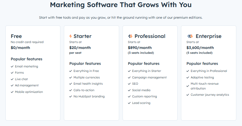| Support | Community forums | Standard HubSpot support | Standard HubSpot support | Priority/dedicated support |