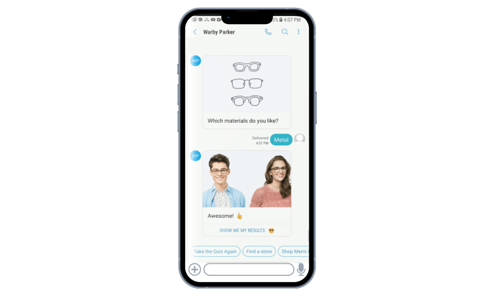 This recognized eyewear brand uses the capabilities of RCS messaging to improve client experience, streamline the purchasing process, and even collect data on clients’ preferences. In this campaign example, we can see that they opt for the quick reply feature to conduct a quiz on clients’ preferred eyewear models. In just one click and without the need to type, customers can choose what they like. It simplifies and quickens answering, which makes it more encouraging for clients to engage. Additionally, the brand can then use the collected information for personalized product suggestions.