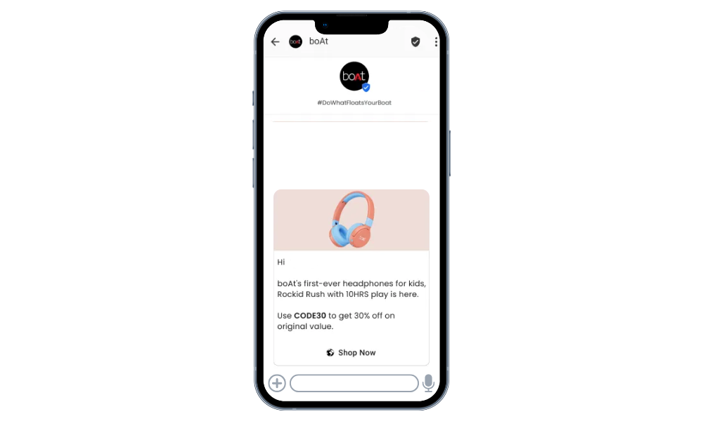 RCS’s media-rich features are being used by brands such as boAT to convey marketing messages. You can see how the rich card on this RCS campaign example includes an image of the product, a brief description, a discount, and a call to action that allows recipients to get the item right away.