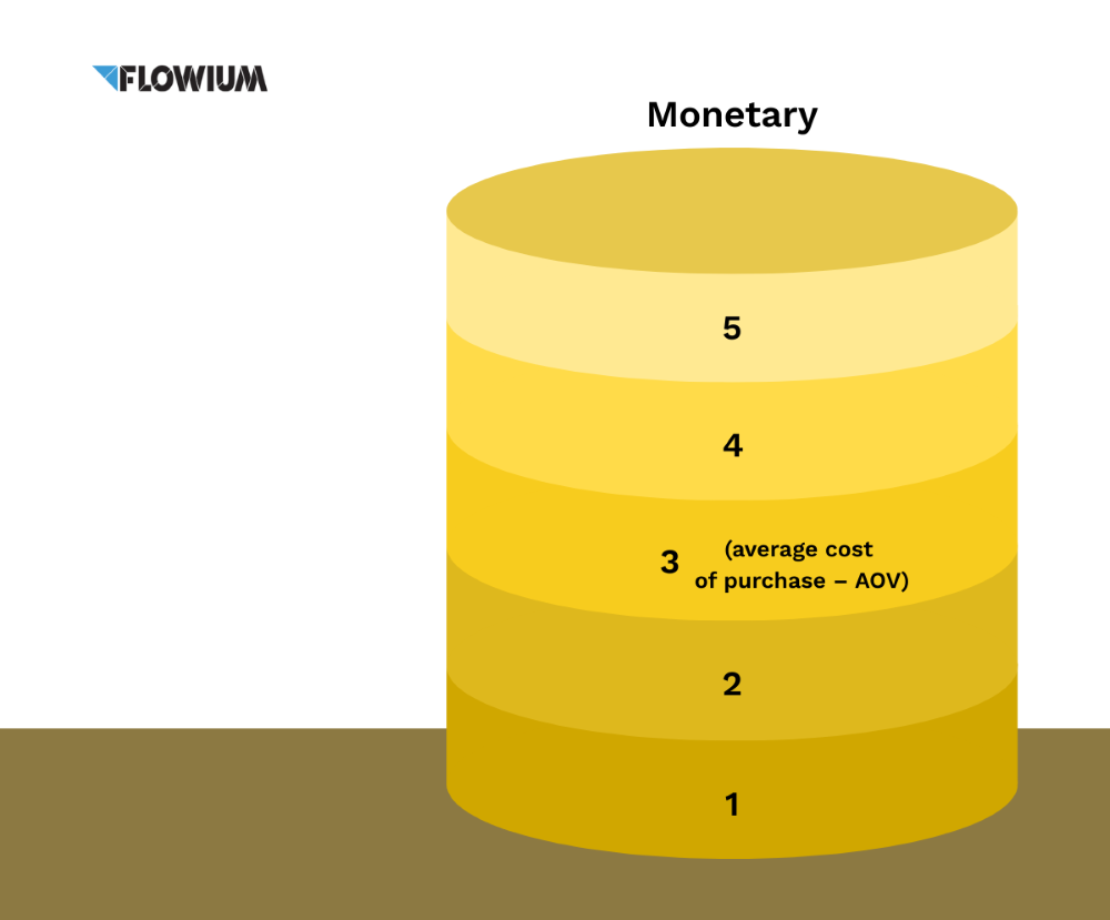 Monetary is almost similar to the frequency principle. It is also based entirely on your business, taking into account your financial flow. And just like in frequency, you can calculate an average number and use it as a basis for estimation. Only in monetary it will be the AOV—average order value.