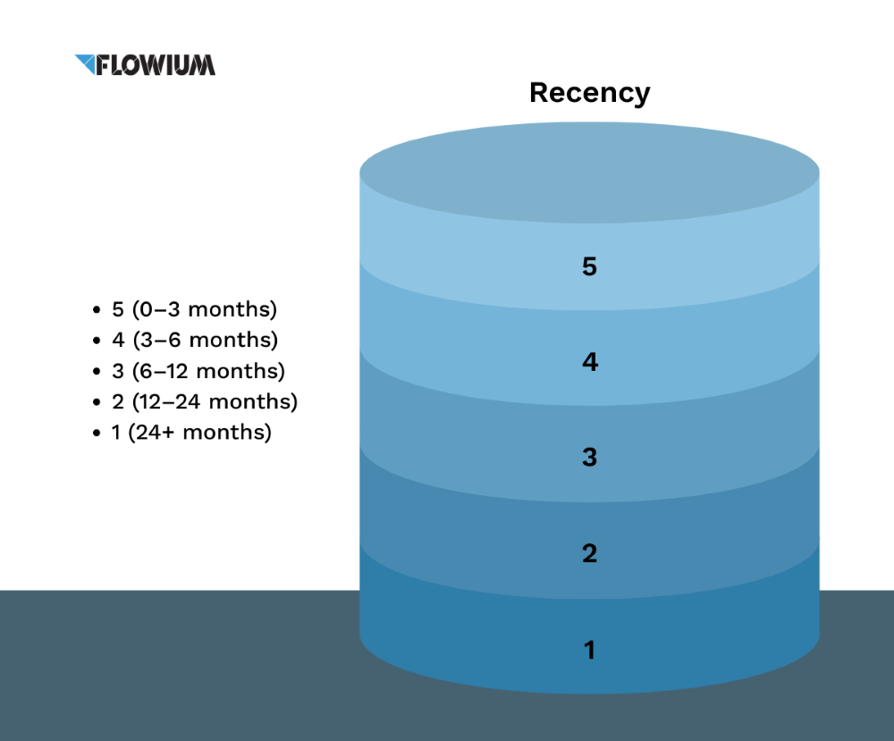 The scheme for recency is quite simple. The rating is based on the time that has passed since the purchase. Of course, you can adjust this time to your business by setting your time frame.