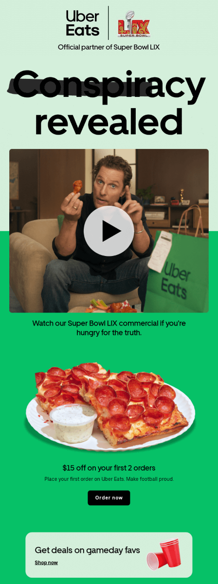 Uber Eats always delivers… Not only your orders, but also high-quality emails for the Big Game. As an official Super Bowl partner, they know how to promote both the event and their services. The company uses a lot of interactive elements, including the video you can see in the example below, to increase engagement and generate interest in their offers. They also provide a special deal for the game day, offering a $15 discount to boost sales on this day.