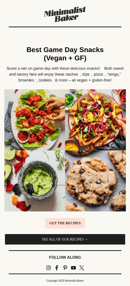 To increase engagement before the Game Day, you can also offer some recipes that your subscribers can cook at home. Opt for simple dishes and snacks perfect for the party. You can introduce them right in your Super Bowl email or make a downloadable document and present them in the message as a lead magnet. This strategy will help you to boost your click-through rates.