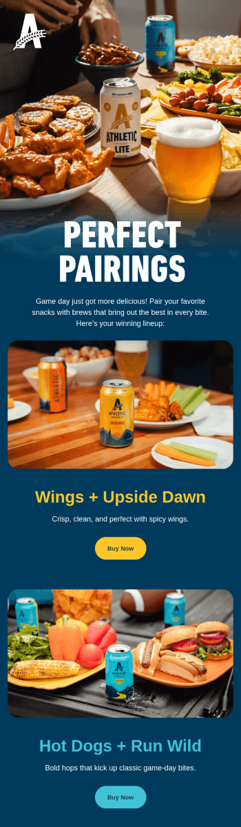 Businesses often use this type of email for Super Bowl promotions because it offers a perfect opportunity to introduce bundle deals. You can promote products that match to encourage people to buy them together and increase your sales. This “Perfect Match” email works especially effectively on Game Day for the Food and Beverage industry, where you can offer not just snacks but drinks that go well with them. Of course, businesses in other segments can adjust this bundle deal strategy for their assortment and offerings.