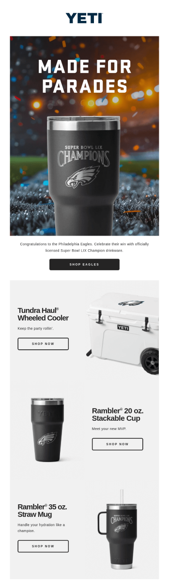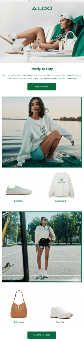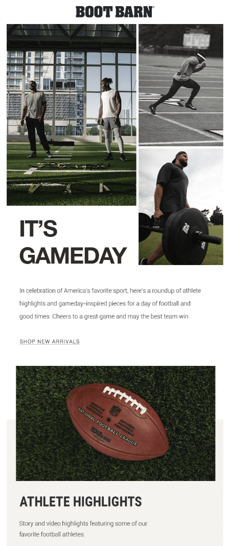 As a global fashion brand that focuses on footwear and accessories, ALDO can’t miss the chance to showcase its sports-related collection before the game starts. In this Super Bowl email example, you can see how they build a promotional campaign around the event by offering subscribers outfit ideas with the brand’s products. The minimalistic layout and design fit the overall branding of ALDO, but the green color also represents the football theme. Simple email copy and straightforward CTAs help to effectively direct customers to the goal action.