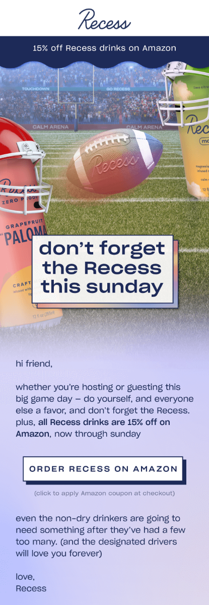 Bev is a beverage company that sells canned wines with an emphasis on sustainability, convenience, and diversity. Its marketing frequently uses an upbeat and inspiring tone. The Super Bowl campaign example below is a great illustration of the brand’s approach. The positive title addresses the fans, no matter the team they’re rooting for, and inspires them to focus on having fun. “Something for everyone” is the strategy they use to market their beverages within this email. To make its offer more appealing to sports lovers, the brand even added sugar and carb count.